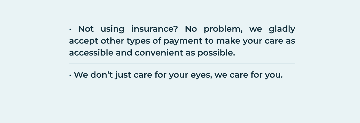 We proudly accept MediCare plans and commercial PPO insurance. For patients without insurance, we offer fair, transparent pricing and accept CareCredit and truly believe we are the best practice for high-quality, accessible eye care.